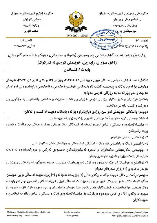 وەزارەتی پەروەردەی حکومەتی هەرێمی کوردستان رێنمایی تایبەت بە دەستپێکی دەوامی ساڵی نوێی خوێندنی 2022 -2023 قوتابخانە (حکومی و ناحکومییەکان) بڵاوکردەوە.