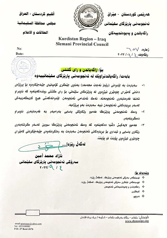 ئهنجومهنی پارێزگای سلێمانی ئەمڕۆ یەکشەممە جارێكی دیكه به فهرمی نایاسایی بوونی دانانی كامێراكانی هاتوچۆی راگهیاند و رێككاری یاسایی دهگرێتهبهر.