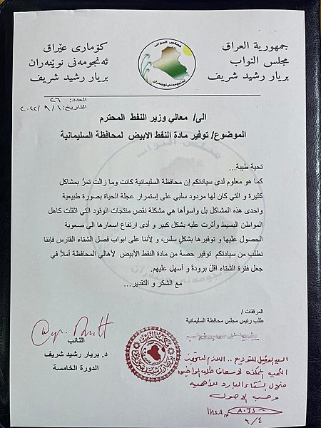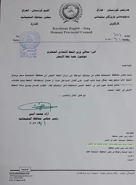- لەسەر داواکاریەکی ئێمە وەزیری نـەوت بڕیاریدا بەشە نـەوتی سپی پێویست بۆ پارێزگای سلێمانی دابین بکات بڕەکـەی لە 15 ملیۆن لیتر زیاتربێت و پێش هاتنی وەرزی سەرما بگاتە سلێمانی و دابەشبکرێت.