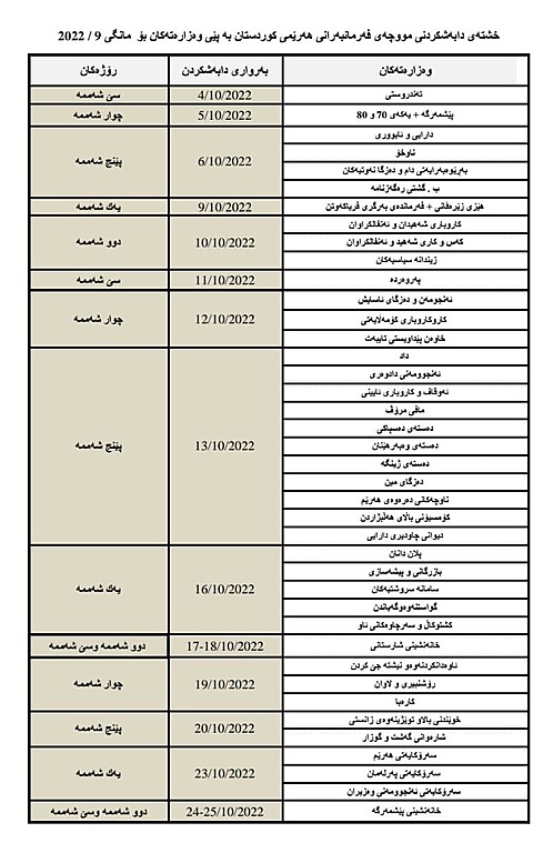 وەزارەتی دارایی و ئابووریی حکومەتی هەرێمی کوردستان خشتەی مووچەی مانگی ئەیلولی 2022ی سەرجەم وەزارەتەکانی بڵاوکردەوە، بەپێی خشتەکە بێت رۆژی سێشەممەی داهاتوو دەست بە دابەشکردنی مووچە دەکرێت.