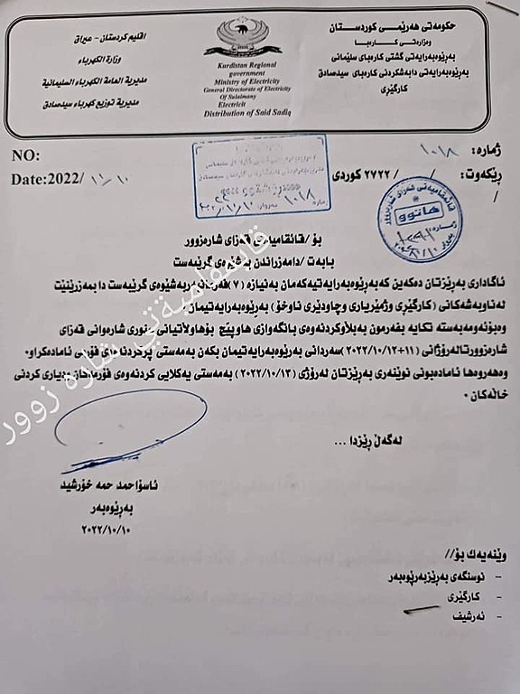 بـەڕێوەبـەرایەتی دابـەشكردنی كـارەبـای سەیدسادق لە راگەیەنراوێكدا ئاماژەی بەوەكردووە، هـەركـەس ئـارەزومەندە دابـمەزرێت بـەشێوەی گـرێبەست لـە بەڕێوەبەرایەتییەكە لەنـاو قـەزای سەیدسادق دەتوانێت لـە رۆژانی (11 و 2022/10/12) بـۆ وەرگرتنی فۆڕمی دامەزراندن سەردانیان بكەن.