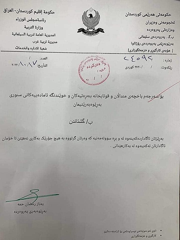پەروەردەیەك سەرجەم خوێندگەكانی سنورەكەی ئاگادار دەكاتەوە