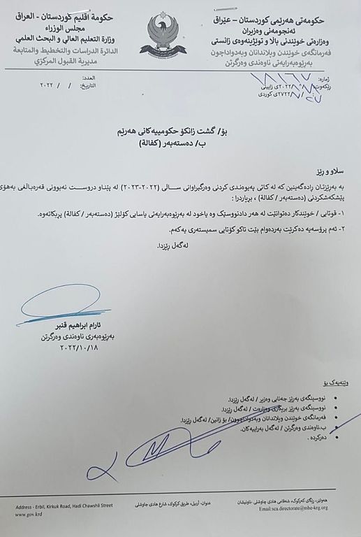 وەزارەتی خوێندنی باڵاو توێژینەوەی زانستی بڕیارێك لە بەرژوەندی خوێندكارانی تازە وەگیراو لە زانكۆكان دەدات و ئاشكرایدەكات "تا كۆتایی سمیستەری یەكەم مۆڵەت هەیە بۆ پێشكەشكردنی دەستەبەر (كفالە)".