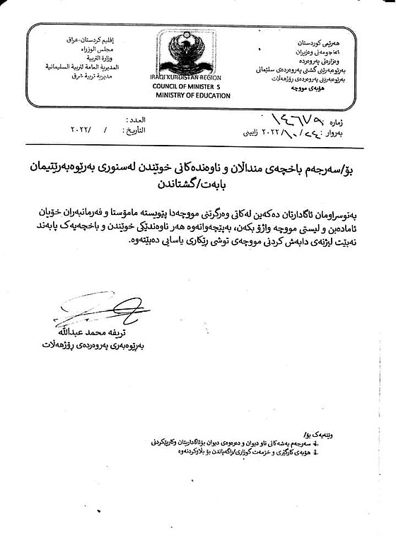راشیگەیاندووە "هەر ناوەندێكی خوێندن یاخود باخچەیەك پابەند نەبێت لیژنەی دابەشكردنی مووچە بەرپرسیار دەبن".
