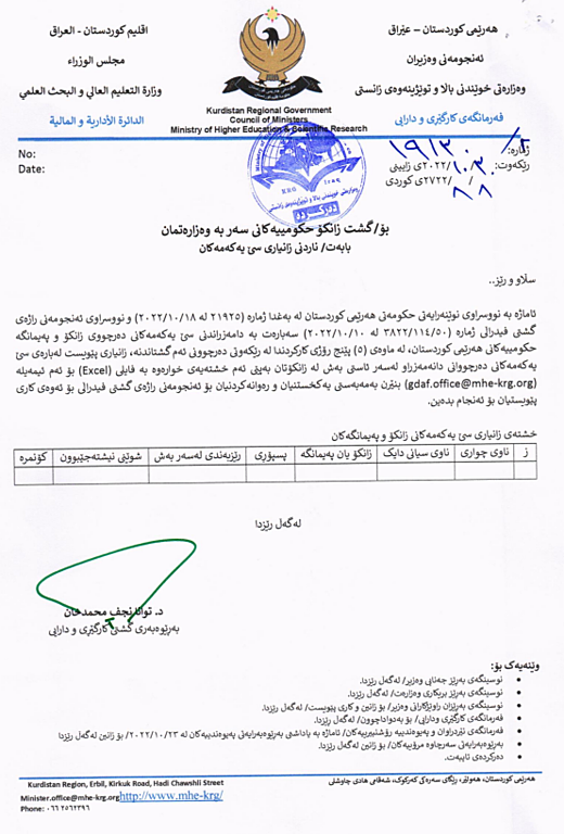 بەپێی نوسراوێكی وەزارەتی خوێندنی باڵاو توێژینەوەی زانستی حكومەتی هەرێمی كوردستان كە ئیمزای توانا نەجەف، بەڕێوەبەری گشتی كارگێڕی و دارایی لەسەرەو ئاراستەی سەرجەم زانكۆ حكومییەكان كراوە تێیدا هاتووە "ئاماژە بە نوسراوی نوێنەرایەتی حكومەتی هەرێمی كوردستان و نوسراوی ئەنجومەنی راژەی گشتی فیدراڵی لە 10-10-2022 سەبارەت بە دامەزراندنی سێ یەكەمەكانی زانكۆ و پەیمانگە حكومییەكانی هەرێمی كوردستان لە ماوەی 5 رۆژی كاركردن لەدوای بڵاوكردنەوەی گشتاندنەكە زانیاری لەبارەی سێ یەكەمەكانی دانەمەزارو لە سەر ئاستی بەشەكانی زانكۆ حكومییەكان رەوانە بكەن".