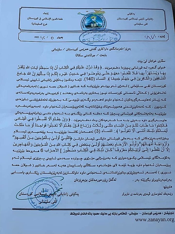 بەپیی نوسراوێكی یەكێتی زانایانی ئاینی ئیسلامی كوردستان لقی سلێمانی رۆژی 5ی12ی2022 لەسەر راسپاردەی مەكتەبی تەنفیزیی یەكێتی زانایان، سكاڵای یاسایی لەرێی داواكاری گشتی لەسەر ئەو ئافرەتە تۆمار كرا كە لەبەرنامەیەكی تەلەفزیۆنی رایگەیاند "فرەژنی بەشێكە لە لەشفرۆشی".