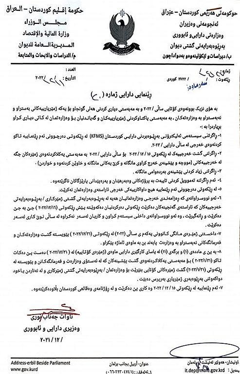 ئەمڕۆ یەکشەممە 11ی کانونی یەکەمی 2022 وەزارەتی دارایی و ئابووریی حکومەتی هەرێمی کوردستان رێنمایی دارایی ژمارە (20)ی ساڵی 2020 دەرکرد کە تایبەتە بە راگرتنی خەرجی بۆ ساڵی دارایی 2022، بەهۆی نزیکبوونەوەی ساڵی نوێ.