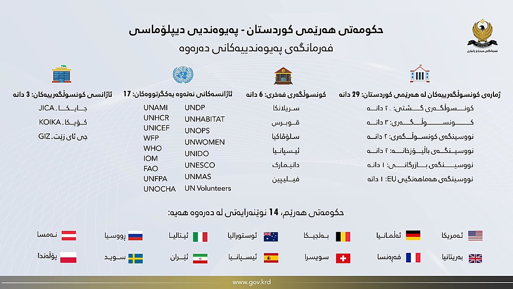 ماڵپەری فەرمانگەی میدیاو زانیاری حكومەتی هەرێم ئاشكرایكردووە "حكومەتی هەرێم 14 نوێنەرایەتی هەیە لە وڵاتان و 29 كونسوڵگەریش لە هەرێمی كوردستان بوونیان هەیە و 6 كونسوڵگەری فەخری و ئاژانسی نەتەوە یەكگرتووەكانیش ژمارەیان 17 ئاژانسە لە هەرێمی كوردستان و ئاژانسی كونسوڵگەرییەكانیش ژمارەیان 3 كونسوڵگەرییە".
