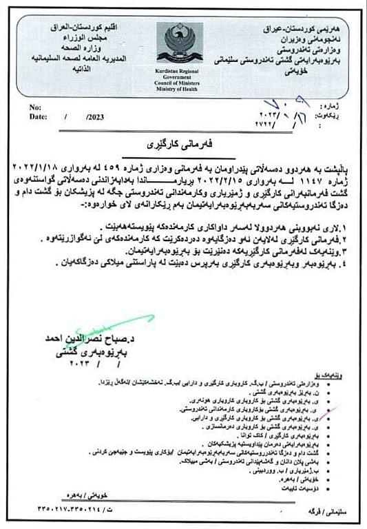 بەرێوبەری گشتیی تەندروستیی سلێمانی دەسەڵاتی گواستنەوەی سەرجەم فەرمانبەرانی ژمێریاری و كارمەندانی تەندروستی و كارگێڕی جگە لە پزیشكان دابەزاند بۆ بەرێوبەری سەرجەم ناوەندە تەندروستیەیكان.