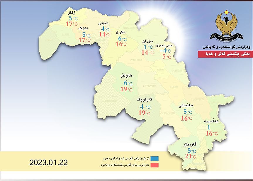بەڕێوەبەرایەتیی گشتیی كەشناسی و بوومەلەرزەزانی هەرێمی كوردستان پێشبینییەكانی كەشوهەوای ئەمڕۆ یەکشەممە 22ی کانونی دووەم و سبەینێ دووشەممە 23ی کانونی دووەمی 2023ی شارەكانی هەرێمی كوردستانی بڵاوكردەوە.