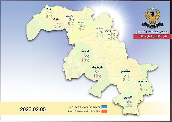 بەڕێوەبەرایەتیی گشتیی كەشناسی و بوومەلەرزەزانی هەرێمی كوردستان پێشبینییەكانی كەشوهەوای ئەمڕۆ یەکشەممە 5ی شوبات و سبەینێ دووشەممە 6ی شوباتی 2023ی شارەكانی هەرێمی كوردستانی بڵاوكردەوە.