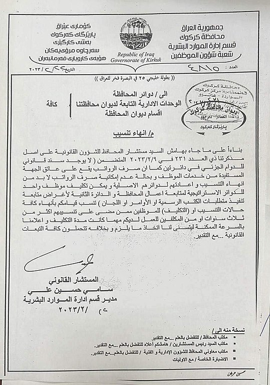 بەپێی نووسراوێکی ئیدارەی بەزۆر سەپێنراوی کەرکوک بێت کە لە رۆژی 22ی شوباتی 2023 دەچووە ئاماژە بەوەکراوە بە کۆتاییهاتنی تەسیبی فەرمانبەران لە تەلاری پارێزگای کەرکوک و فەرمانگەکانی دیکەی حکومەت.