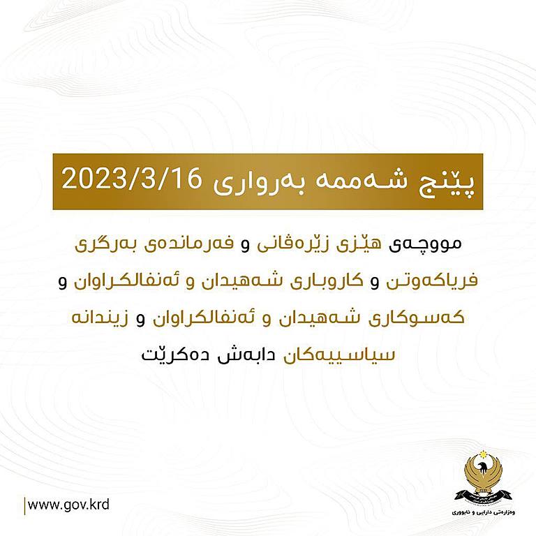 ئەمڕۆ چوارشەممە 15ی ئازاری 2023 وەزارەتی دارایی و ئابووری حکومەتی هەرێم رایگەیاند "سبەی موچەی هەریەک لە (هێزەکانی زێرەڤانی، فەرماندەیی بەرگری و فریاکەوتن، کاروباری شەهیدان و ئەنفالکراوان، کەسوکاری شەهیدان و ئەنفالکراوان و زیندانییە سیاسییەکان) دابەشدەکرێت ".