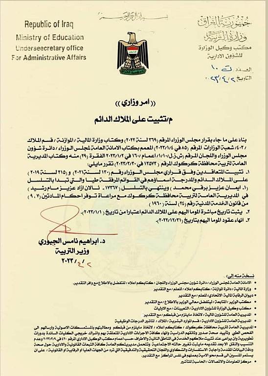 ئەمڕۆ یەکشەممە 2ی نیسانی 2023 وەزارەتی پەروەردەی عیراق لە نووسراوێکدا کە ئیبراهیم جبووری، وەزیری پەروەردە واژۆی لەسەرکردووە بڕیاردرا بە دامەزراندنی مامۆستایانی وانەبێژانی شاری کەرکوک.