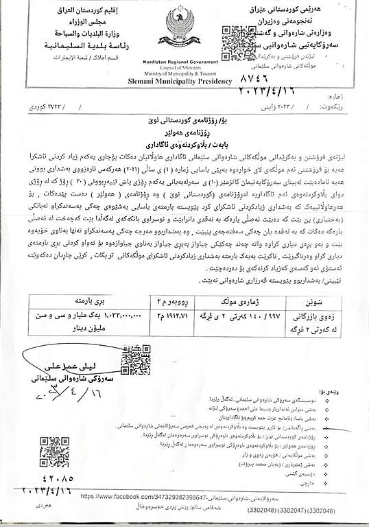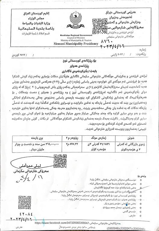 سەرۆکایەتیی شارەوانیی سلێمانی 11 پارچە زەوی نایابی گرانبەها دەخاتە مەزادێکی ئاشکراوە کە بە بەهای سەدان ملیۆن دۆلارە پارەکەی تەرخاندەکات بۆ تەواوکردنی پرۆژەی شەقامی 100 مەتری سلێمانی.