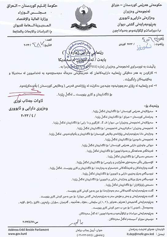 بەپێی نووسراوێکی وەزارەتی دارایی و ئابووریی حکومەتی هەرێمی کوردستان بێت کە تیادا هاتووە، لەمەودوا کار بە هیچ رێنماییەک ناکرێت کە خەرجکردنی دەرماڵە دەبەستێتەوە بەئەندامبوون لە سەندیکا و یەکێتیەکان و هەر رێنماییەک پێشتر دەرچوبێت لەمەودوا رادەگیرێت.