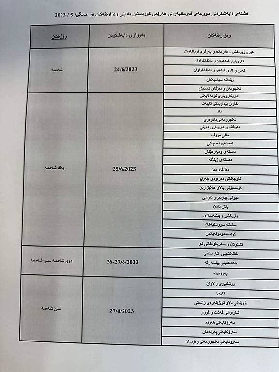 بەپێی ئەو خشتەیەی بڵاوكراوەتەوە، هەتا رۆژی سێشەممە 27ی حوزەیران، واتا هەتا پێش جەژنی قوربان، سەرجەم مووچەخۆران و فەرمانبەران مووچەی مانگی ئایار وەردەگرن.
