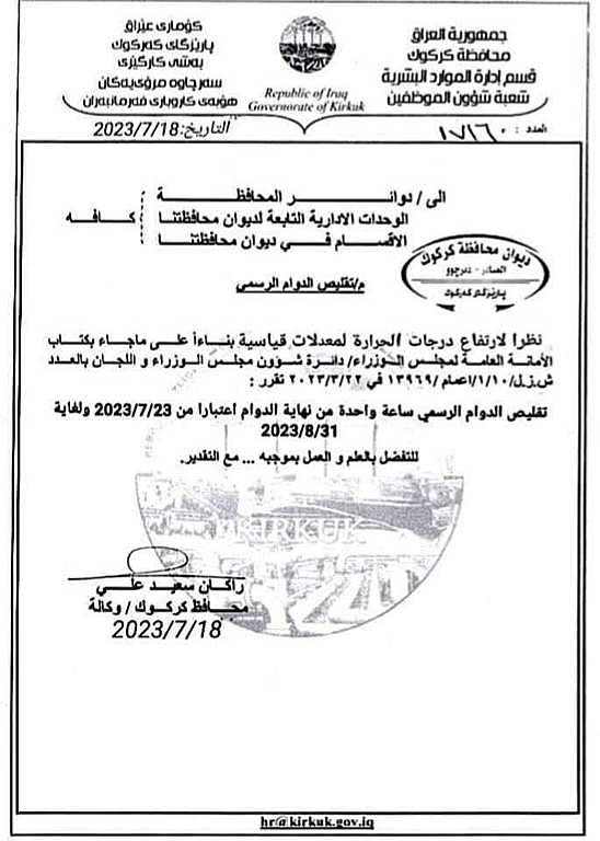 بەپێی نووسراوێک کە راکان جبووری، پارێزگای کەرکوک واژۆی کردووە تیادا بڕیار دراوە کاتژمێرێك لە کۆتایی دەوامی فەرمانگەکان کەمبکرێتەوە بەهۆی بەرزبوونەوەی پلەکانی گەرماوە، بڕیارەکەش لە 23ی تەموز تاوەکو 31ی ئابی 2023 جێبەجێ دەکرێت.