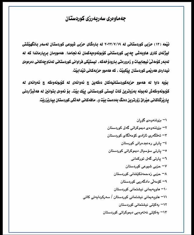 بەپێی ئەو راگەیەندراوە بێت کە بڵاوکراوەتەوە پارتی دیموکراتی کوردستان لە کۆبوونەوەکە بەشداری نەکردووە، تەنها ئەو 13 حزبە بوون.
