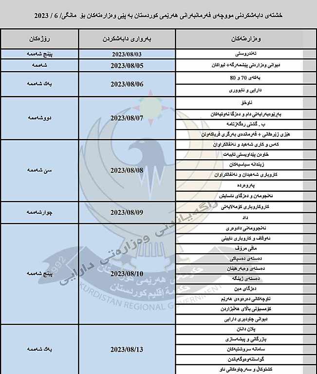 ئەمڕۆ پێنجشەممە 3ی ئابی 2023 وەزارەتی دارایی و ئابووری حکومەتی هەرێمی کوردستان خشتەی دابەشکردنی مووچەی فەرمانبەرانی بۆ مانگی حوزەیران بڵاوکردەوە.