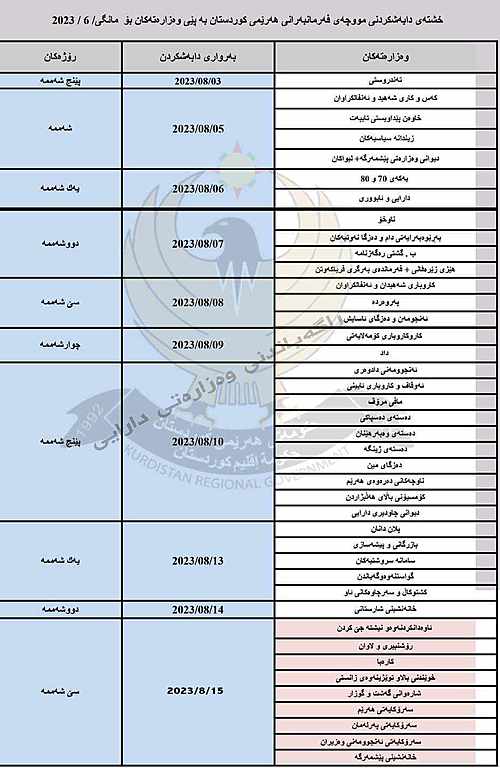 بەپێی راگەیەندراوەکە، سەرجەم وەزارەت و دامودەزگاکان مووچەکانیان لە 12 رۆژدا وەردەگرن کە لە بەرواری 3ی ئابەوە دەستپێدەکات و رۆژی 15ی ئاب کۆتایی بە دابەشکردنی مووچە دێت.