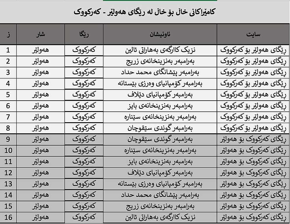 ئەو 16 شوێنەی كامێراكانی خاڵ بۆ خاڵیان تێدایە لەنێوان هەولێر - كەركوك بەمشێوەیەیە؛