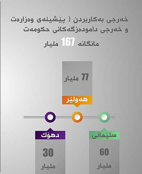 ٦-خەرجی مانگانەنەی دام و دەزگاکانی حکومەتی هەرێم لەگەڵ پێشینەی وەزارەت و دام و دەزگاکان مانگانە لەسەر ئاستی هەرێمی کوردستان نزیکەی ١٧٠ ملیار دینارەو ئەوەش هەموی لە داهاتی ناوخۆ دابین دەکرێت کەلە ساڵێکدا نزیکەی دوو ترلیۆن دینارە.