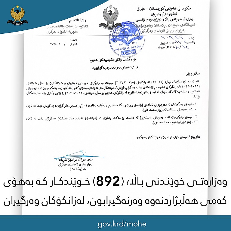 لای خۆیەوە عەباس ئەکرەم، وتەبێژى وەزارەتى خوێندنى باڵا ئاماژەی بۆ ئەوەکرد "لەسەر فەرمانى د. ئارام محمد قادر، وەزیرى خوێندنى باڵا، بە ئامانجى پێدانى دەرفەت بەوانەى بەهۆى کەمى هەڵبژاردنەوە وەرنەگیرابوون، وەزارەتى خوێندنى باڵا بڕیاریدا بە وەرگرتنى (860) لە دەرچووانى ئامادەیی زانستى و وێژەیی و (32) لە دەرچووانى پیشەییەکان لە زانکۆکانى هەرێمى کوردستان بۆ ساڵى خوێندنى (2025-2026)".