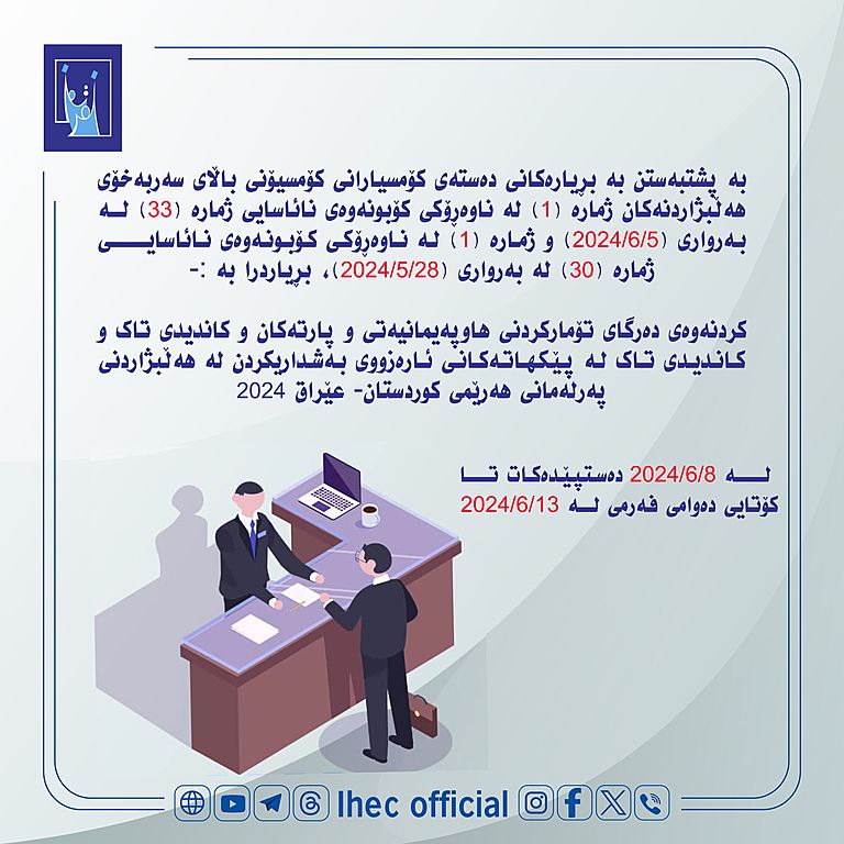 بەپێی بڵاوکراوەکەی کۆمیسیۆن دەرگای تۆمارکردنی هاوپەیمانییەتی و پارتەکان و کاندیدی تاک و کاندیدی تاک لە پێکهاتەکان لە 8-6-2024 دەستپێدەکات تاوهكو کۆتایی دەوامی فەرمی لە 31-6-2024.