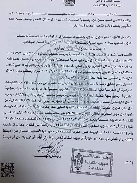 بهپێى نووسراوێكی دهستهی دادوهریی كۆمیسیۆنی ههڵبژاردنهكانی عیراق، مۆڵهتی كاركردن له ههر سێ پارتی سیاسیی ( ئازادی و دیموكراسی ئێزدی، بهرهی خهباتی دیموكراتیك و تهڤگهری ئازادیی كۆمهڵگهی كوردستان ) وهرگیراوهتهوه.