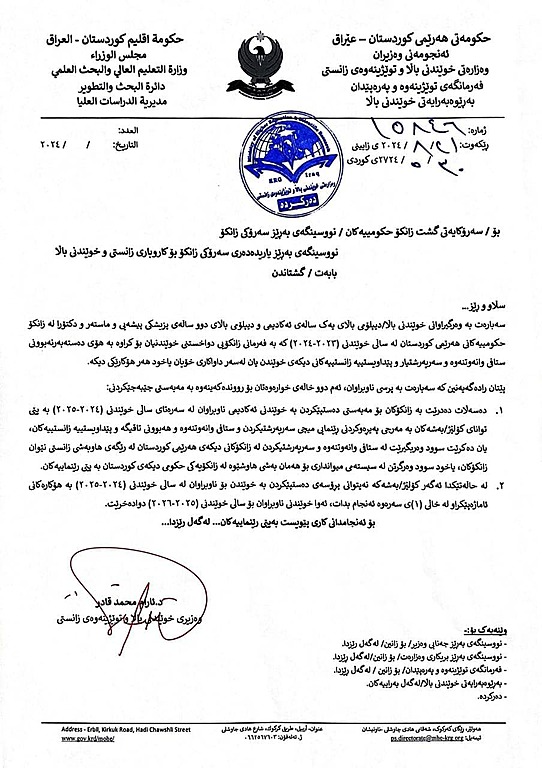 ئهمڕۆ 21ی ئابی 2024، وەزارەتی خوێندنی باڵا و توێژینەوەی زانستیی حکومەتی هەرێمی کوردستان بڕیارێکی دەرکرد و گشتاندنی پێکردووە بۆ سەرجەم زانکۆ حکومییەکانی هەرێمی کوردستان، لەبارەی وەرگیراوانی خوێندنی باڵا/ دیپلۆمی باڵا و ماستەر و دکتۆرا لە زانکۆکانی ھەرێمی کوردستان لە ساڵی خوێندنی (2023-2024) کە دواخستنی خوێندنیان بۆ کرابوو.