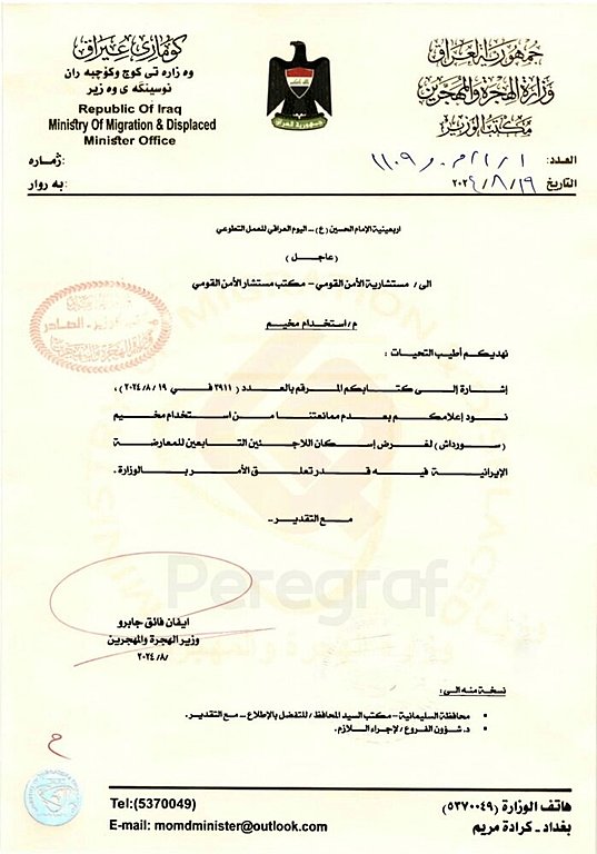 له نوسراوهكه هاتووه "به پشتبەستن بە نامەی فەرمی راوێژکاری ئاسایشی نیشتمانی عیراق له رۆژى 19ى ئهم مانگه پێشکەشی وەزارەتی کۆچبەران کراوە، هەنگاوی عیراق بۆ جێگیرکردنی حزبه کوردییەکانی رۆژههڵات لە کەمپەکانی هەرێمی کوردستان هاوتەریبە لەگەڵ جێبەجێکردنی بڕگەکانی رێککەوتنی ئەمنی ئێران و عیراق".