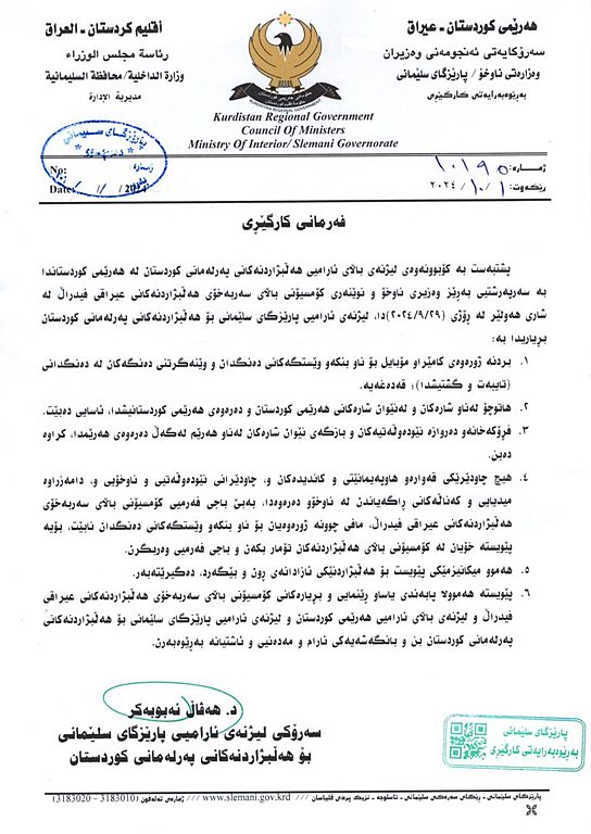 لیژنەی ئارامیی پارێزگای سلێمانی، لەبارەی بەڕێوەچوونی هەڵبژاردنی پەرلەمانی کوردستان چەند بڕیارێکی دهر كرد و رایدهگهیهنێت "بردنە ژوورەوەی کامێرا و مۆبایل بۆ بنکە و وێستگەکانی دەنگدان قەدەغەیە".