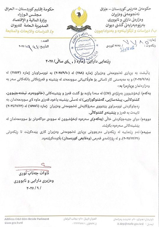 وەزارەتی دارایی و ئابووریی هەرێم بڵاویکردەوە لەسەر پێشنیاری وەزارەتەکەیان بە نووسراوی ژمارە ( 305) لە 2025/7/7 ، و بەمەبەستی کارئاسانی بۆ هاوڵاتییانی سوودمەند لە پێشینەو قەرزی بانکەکان.