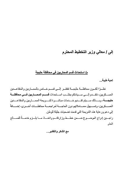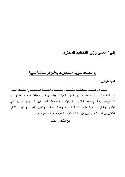 ئەوەشی خستەڕوو "هەروەها بەڕێوەبەرایەتی هەواڵگری و ئاسایش و بەشی جەنگاوەری دێرین (هاوشێوەی پێشمەرگە دێرینەکان) بەو پێیەی لەئێستادا هەڵەبجە یەکێکە لە پارێزگا فەرمییەکانی عیراق و پێویستە ئەم بەش و بەڕێوەبەرایەتییانە بکرێتەوە".