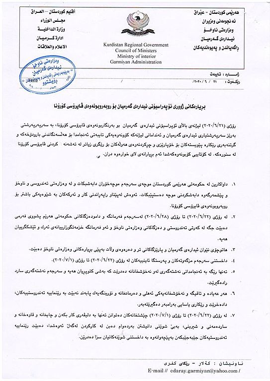 لیژەی بەرەنگاربوونەوەی ڤایرۆسی كۆرۆنا لە ئیدارەی گەرمیان چەند بڕیارێكی دەركرد و چەند شوێنێكیش دادەخرێن و یەك هەفتە پشووی بۆ دامەزراوەكان راگەیاند، هەروەها قەدەغەی هاتووچۆی نێوان ئیدارەكەو پارێزگاكانی ترو دەرەوەی وڵاتیش بەپێی بڕیاری وەزارەتی ناوخۆ دەبێت.